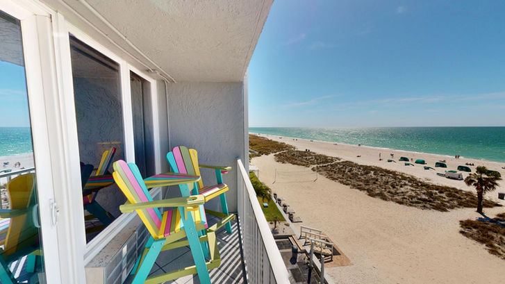 An Executive beachside unit with a private balcony featuring seating for two, perfect for watching the legendary Treasure Island sunsets.